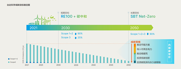 台达相应国际及国家号召,通过自主节能、太阳能自发自用及购买绿电或可再生能源凭证等做法,在日常营运中落实节能减碳,2021年碳密集度较 2014 年下降 71%,提前 4 年达成原订 2025 年碳密集度下降 56.6% 的科学减碳目标(SBT)。并进一步加入 Business Ambition for 1.5°C 行动,呼应全球控制升温 1.5°C 的减排路径,订定 2050 年全球网点达成净零排放(Net Zero)的长期策略与目标[2],于2022年正式通过科学减碳目标倡议组织 SBTi 认可,成为全球第 125 家通过 SBTi Net Zero 目标审查的企业。