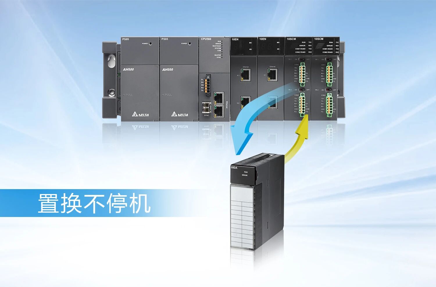 AH500主机及相关模块均采用热插入更换设计,无需停机即可置换相应的故障模块;置换完成,新模块会自动回复正常工作状态,不需使用者手动设定或切换状态。