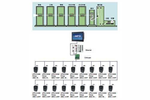 无纺布又称之为不织布,是新一代环保材料,无纺布生产线设备主要有分为前纺和针刺。前纺包括:送棉箱、松开机、气压棉箱、梳理机、铺网机;针刺包括:针刺机组、烫平、储布架、压辊、收卷。其中针刺根据刺位可分为:倒刺、正刺、异位对刺。以下介绍基于台达CANopen总线在无纺布针刺机上的应用。