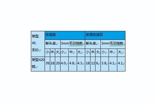 ■ 提高质量,降低断头率和改善毛羽值:因降低了小纱和大纱的断头率而中纱的断头率也得到了改善,因此千锭断头率大大降低。变频器的平滑变速功能对减少纱线的毛羽效应较好,有利于减小大、中、小纱毛羽值。图表为某厂细纱机变频改造前后断头率和毛羽指数对比。