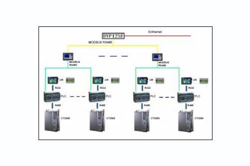 ■ 稳健方案:利用台达变频器RS485接口的MODBUS通讯功能,配合台达DVP系列PLC的通讯程序,可以在不同纱线长度段改变变频频率,达到产量和质量的优化。具体配置为:DOP系列触摸屏(或TP系列文本显示器)+DVP ES2系列PLC+ CT2000变频器。图3