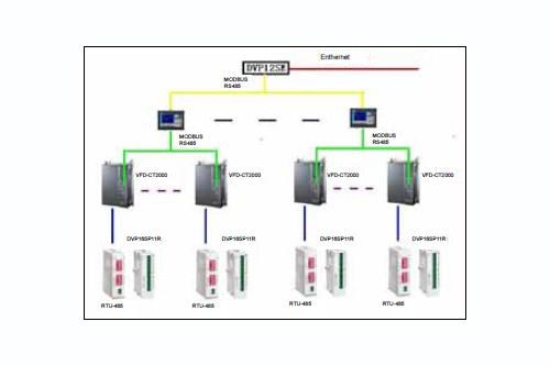 ■ 优化方案:因台达CT2000变频器内部集成了PLC和文本显示器,用一台CT2000变频器就可以实现触摸屏(或文本显示器)+PLC+变频器的全部功能,借助CT2000内建PLC的MODBUS RS485主站功能,通过远程IO(RTU485模块+IO模块),即可简单构建系统。