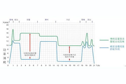台达伺服油电系统能精确控制整个注塑过程所需的压力与流量,消除高压节流的能源损耗,达到节能省电的效果,并同时降低系统油温,是一举数得的系统,节能率高达70%,平均节能率30%以上。 图1
