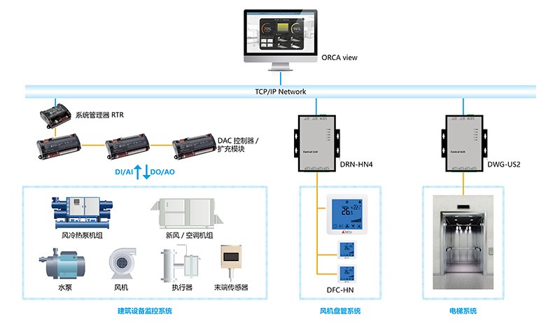 同时,为将危险彻底分散,本项目为每个DDC箱都配置了至少一个控制器;以实现对机电设备的分散控制。本项目中被控大型机电设备及系统主要包括:组合式空调机、热回收新风机、吊顶新风机、送排风机、风冷热泵机组、风机盘管、给排水系统及环境监测,集成接口包括:电梯系统系统。台达Delta Controls ORCA系统充分发挥了其分散性强的特点,其控制器种类多,适合被控设备的不同点数需求,使系统配置达到最优化。