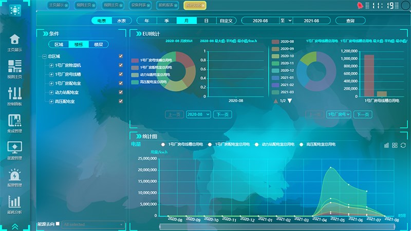在“双碳”政策的的推动下,大型制造业的能耗管理已成为必修课题。工厂管理者需要时刻掌握整厂的耗能情况,寻找优化方案。本FMCS系统的能源管理模板实现了对各类能源设备包括电表、冷热量表、水表等进行集中在线管理,可实时了解其工作状态,并可链接至设备状态页,详细了解设备的各项参数、指标及帮助、维修等各类文件。能源管理模块具备数据可视化功能,通过能源驾驶舱模块,管理人员可实际了解整厂每日能耗情况、实时监测与采集厂务设备的能耗数据并进行数据动态分析、能耗统计等工作。本FMCS系统具有强大的数据统计功能,可以按区域、楼栋、楼层,以年、季、月、日进行EUI统计(能源使用强度),从而找出节能空间,助力运维人员制定节能优化策略。