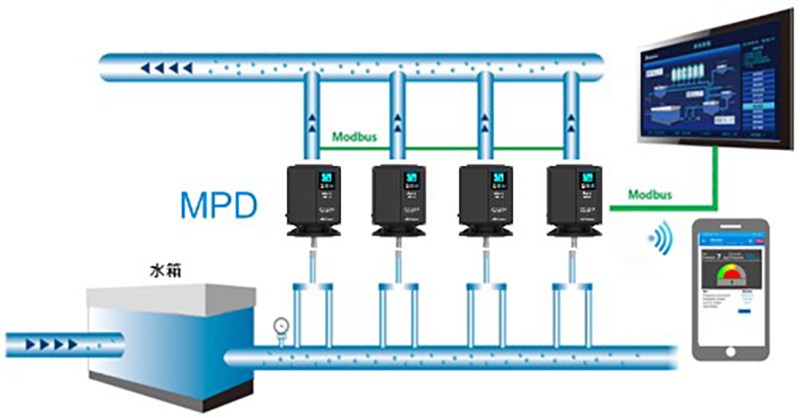 台达背负式水泵一体机MPD系列支持多泵控制模式,最高支持8个水泵。