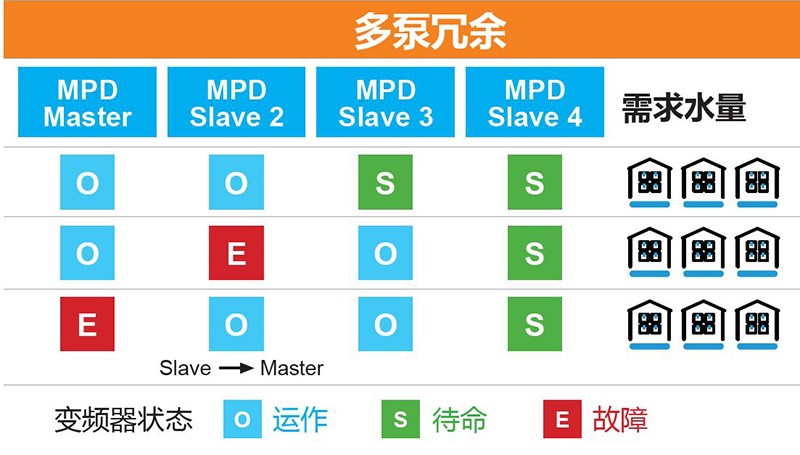 内建的多泵冗余功能,在当主变频器发生意外故障时,其他辅助变频器可自动接替供水,维持系统压力,消除突发的停水风险。