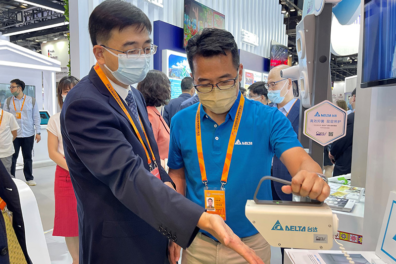 北京市台办主任霍光峰、北京市台办副主任于凤英参观台湾形象展,并到台达展台了解台达以科技助力防疫的展示主题,实际体验柱型及手持式抑菌器,关注抑菌使用效果、适合的应用场景,及与传统紫外线消杀的差异。