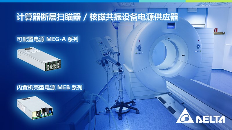 计算器断层扫瞄器及核磁共振设备:为大型高阶医疗设备,检测时会进行高速且维持一定时间的旋转,需要大功率、稳定、且可适应设备运作的电源。台达展出高功率薄型可配置电源供应器MEG-A系列,提供最多9插槽电源框架,可灵活配置3种类型电源模块,依设备需求打造最高3 kW / 2 ~ 60 VDC的供电,功率密度达27 W/inch3,供电效率佳。紧凑的模块化设计,节省安装空间并保留设备电源升级的弹性。MEG-A系列稳定性高,主要应用在医疗影像设备如计算器断层扫描仪,可于高速旋转的情况下提供高可靠的电源。此外针对核磁共振设备的电源需求,亦抢先亮相新上市的内置机壳型电源MEB-2K5A,将以最高31 W/inch3高功率密度和高效供电,进入高阶医疗电源领域。