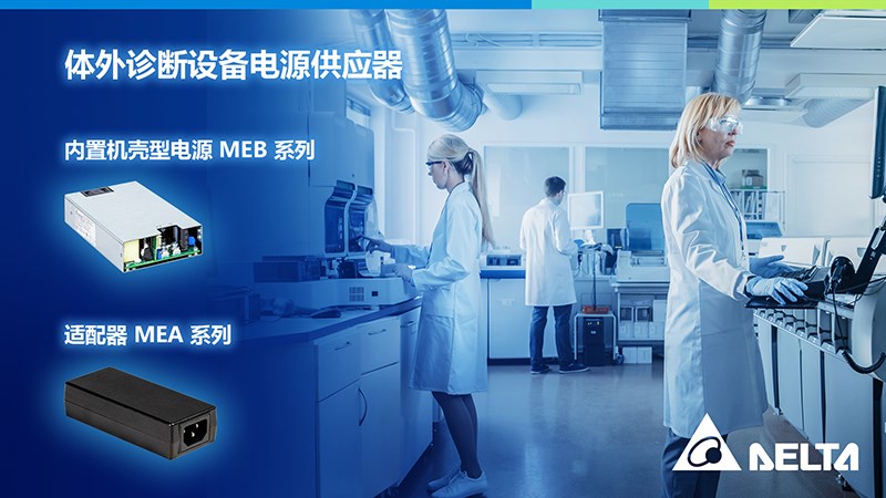 体外诊断设备:为不直接接触人体,利用取自人体的血液、尿液、其他体液或组织切片等,进行人体外试验或分析的医疗器材。此类设备应用的电源供应器,需具备高效稳定供电、良好散热。台达推出内置机壳型电源MEB系列可提供12 V、24 V、48 V 等多种输出电压,且具备强制通风冷却功能。其中MEB-500A机型内建遥控开关装置,便利用户遥控开、关设备电源。另外针对部份需要采用适配器电源的诊断设备,台达推出具备IP22防护等级的适配器MEA系列,达到能效VI级,提供安全高效的电源转换,且亦适用于BF患者接触型医疗设备如睡眠呼吸机。