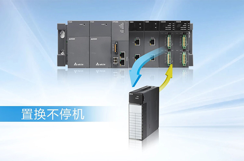 AH500主机及相关模块均采用热插入更换设计,无需停机即可置换相应的故障模块;置换完成,新模块会自动回复正常工作状态,不需使用者手动设定或切换状态。