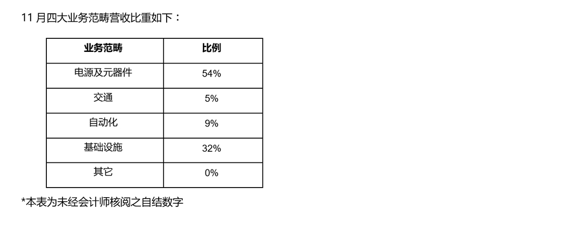 台达电子工业股份有限公司今(10)日公布2025年11月份合并营业额为新台币505.43亿元,较2024年同期合并营业额新台币366.47亿元成长37.9%,较上月份合并营业额新台币573.84亿元负成长11.9%;2025年1~11月份累积合并营业额为新台币5,011.99亿元,较2024年同期累积合并营业额新台币3,824.09亿元成长31.1%。