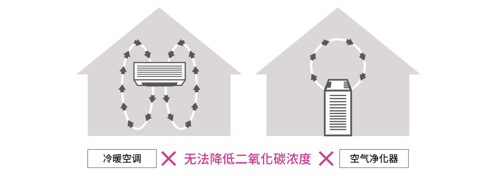 不管是冷暖空调或空气净化器,都是将已存在室内的空气作处理,冷空调吸入室内空气再将空气冷却后,重新放回到室内;空气净化器也是将室内的空气吸入后,将空气净化处理后,再将空气释放到空间内。 经过处理后,室内空气可以变冷、可以变洁净,然而如果没有室外新鲜的空气引进,会造成室内空气中二氧化碳浓度会增加、人体呼吸中的含氧量会不足,造成的影响可能是容易昏昏欲睡、甚至是造成健康上的伤害。