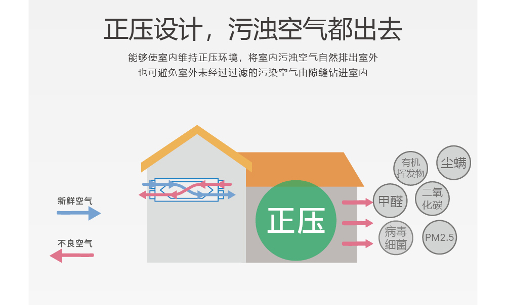 新风系统及全热交换机的功能为改善室内空气品质,和空调冷气、空气净化器是相辅相成,引入室外新空气并经过过滤处理后,去除了室外有害污染物 (如PM2.5等),同时可以将室内不好的空气往外排出(如二氧化碳、装潢后建材或家具残留的有害气体等);当与室外空气交换循环后,室内空气就更让人感到舒适与健康。