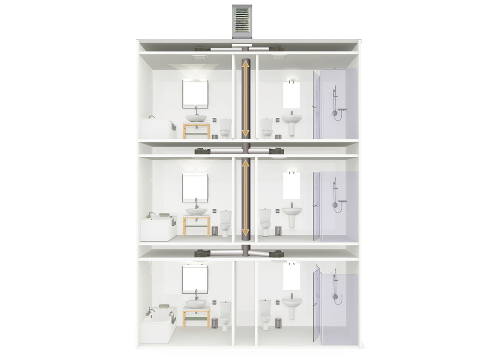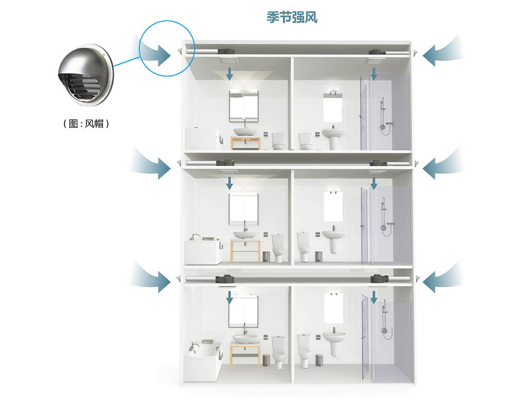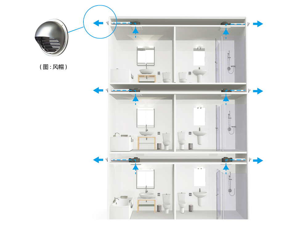 部分集合式住宅,采用单层各户独立的排风设计,会在各居家的浴厕,设计独立的排风口,于各自的外墙安装外气口,没有通风管道互通异味的困扰,避免邻居间的空气交流。