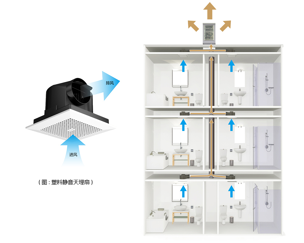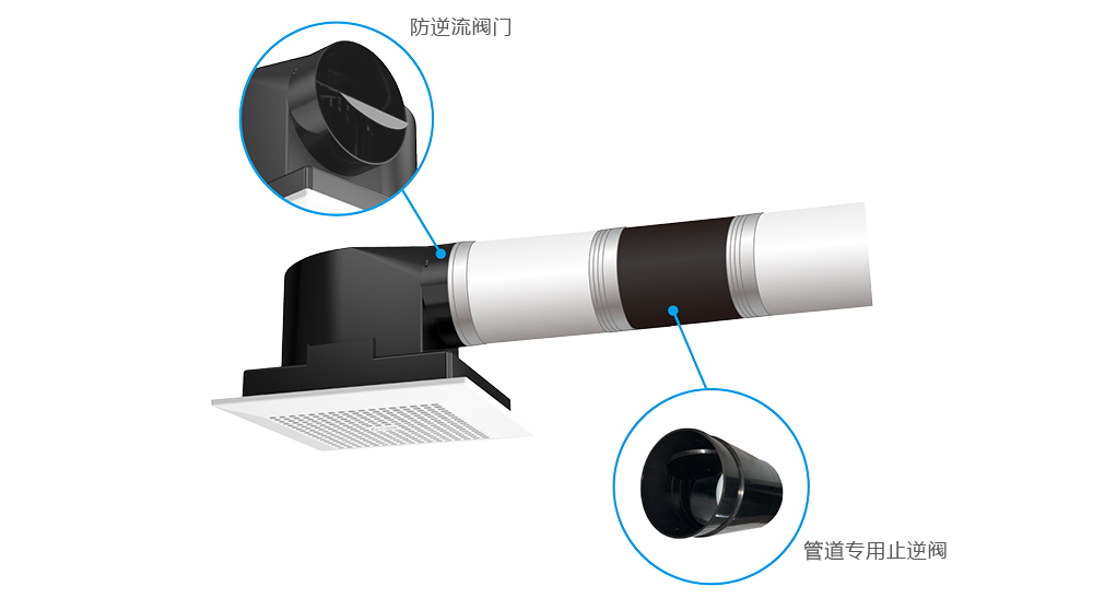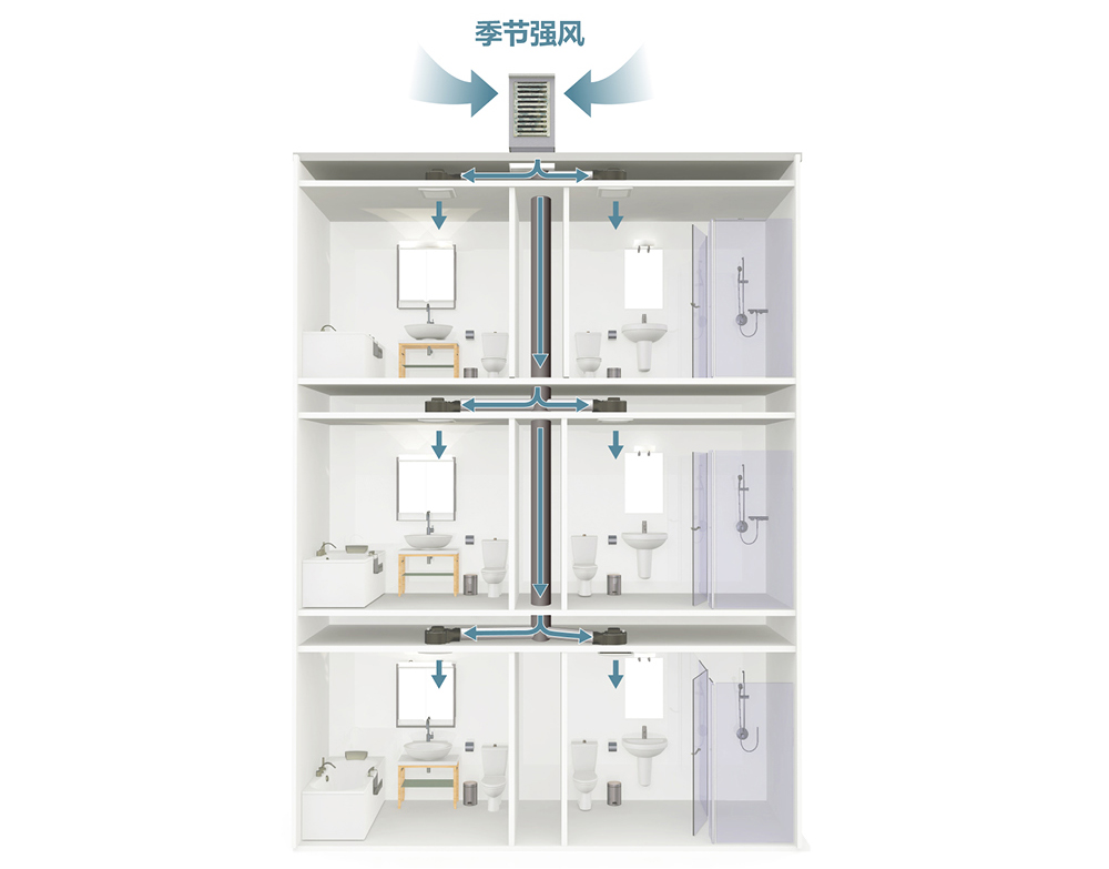 使用换气扇长时间开启,可排出室内的污浊空气,换气扇或暖风机本身的逆止风门,在正常的安装和使用下可以降低管道间的异味,并协助室内的换气。