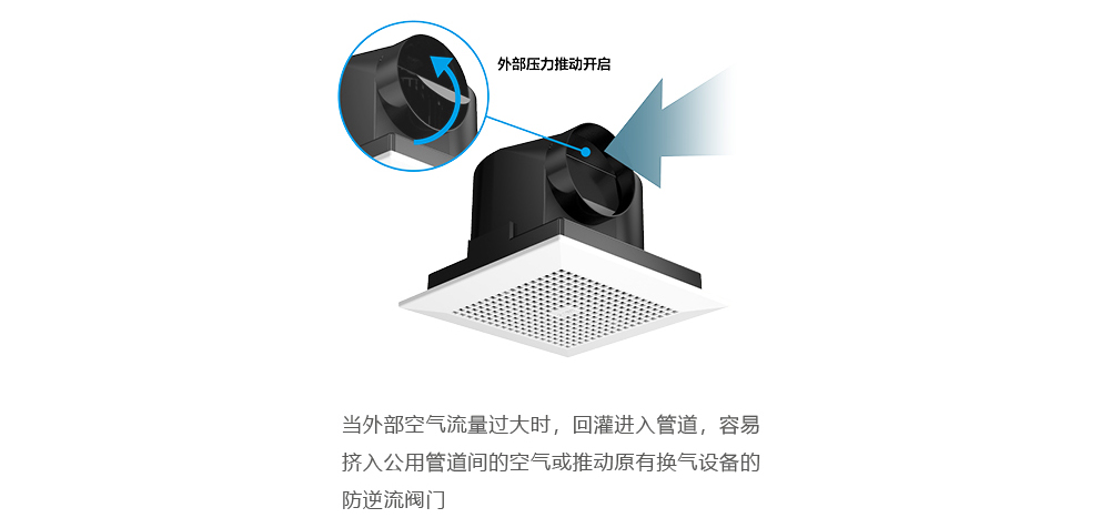 单层排风如排风口位置为环境强风位置,当室外风压过高,排风设备本身的防逆流阀门亦可能被吹动,造成风回灌及声响。