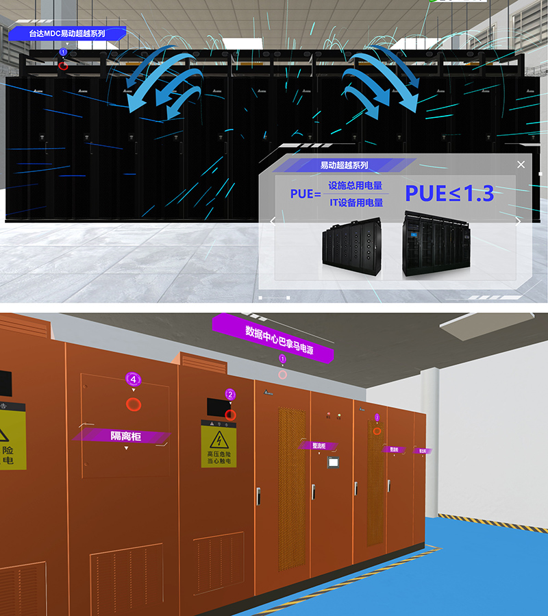 活动现场,台达也运用虚拟现实技术(VR: Virtual Reality)打造出可互动的数据中心裸眼可视化特效,仿真呈现机房动态气流,营造出VR沉浸体验更胜亲临实境,带来截然不同的参展感受,深受到访嘉宾的欢迎。