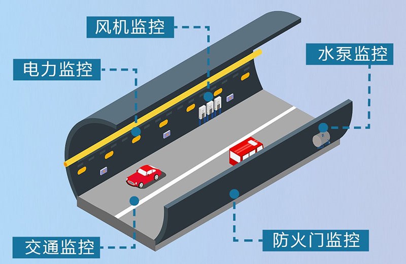 - 交通监控:远程监控隧道内交通信号灯、通行灯、声光报警器及龙门架超高探测;