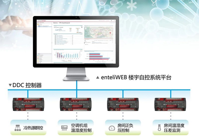通过采用enteliWEB楼宇自控系统和高级应用DDC控制器,配合传感器的精准监测,以及全面的参数采集和被控过程的归纳与经验总结,让历史经验与过程状态结合起来,构成一套自寻优和自适应的控制策略:可依据环境与负荷的变化,自动择优选择系统的优化运行方式,自动控制空调冷热水阀开度,稳定送风温度,保障室内温度时刻处于24℃±1℃。
